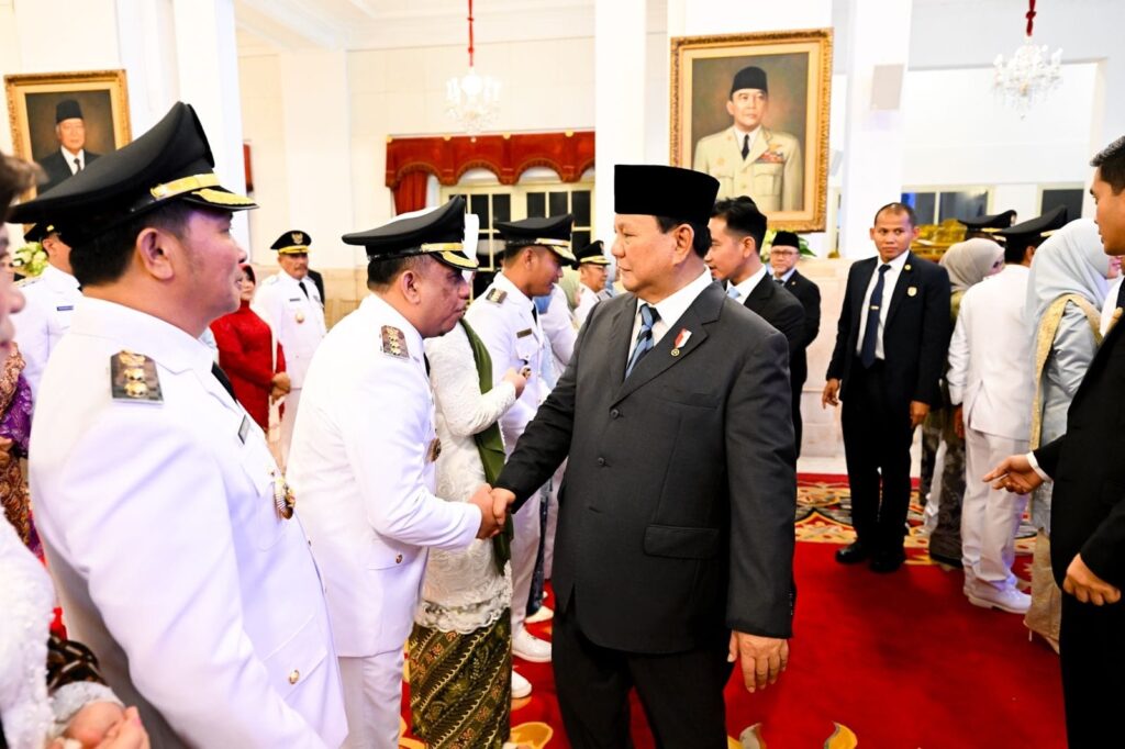 Presiden Prabowo Subianto mengucapkan selamat kepada 961 orang kepala daerah yang baru saja dilantik di halaman tengah Istana Kepresidenan Jakarta.