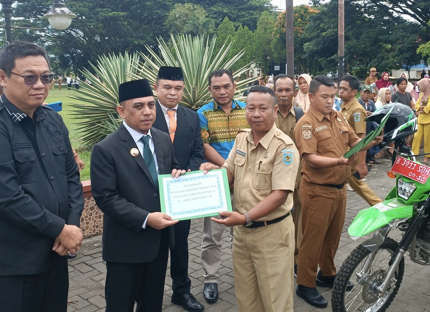 BOLMONG,ambangnews.com — Pemerintah Kabupaten Bolaang Mongondow (Bolmong) terus menunjukkan komitmen dalam memperkuat sektor pertanian. Bertepatan dengan peringatan Hari Pahlawan ke-80 Tahun 2025, Bupati Yusra Alhabsyi menyerahkan lima unit kendaraan dinas roda dua kepada para penyuluh swasembada pangan di bawah naungan Dinas Pertanian Bolmong.
