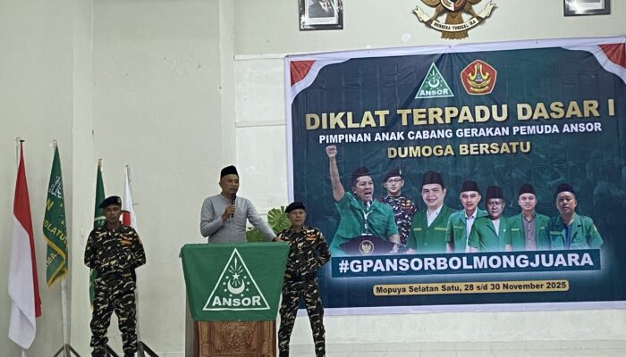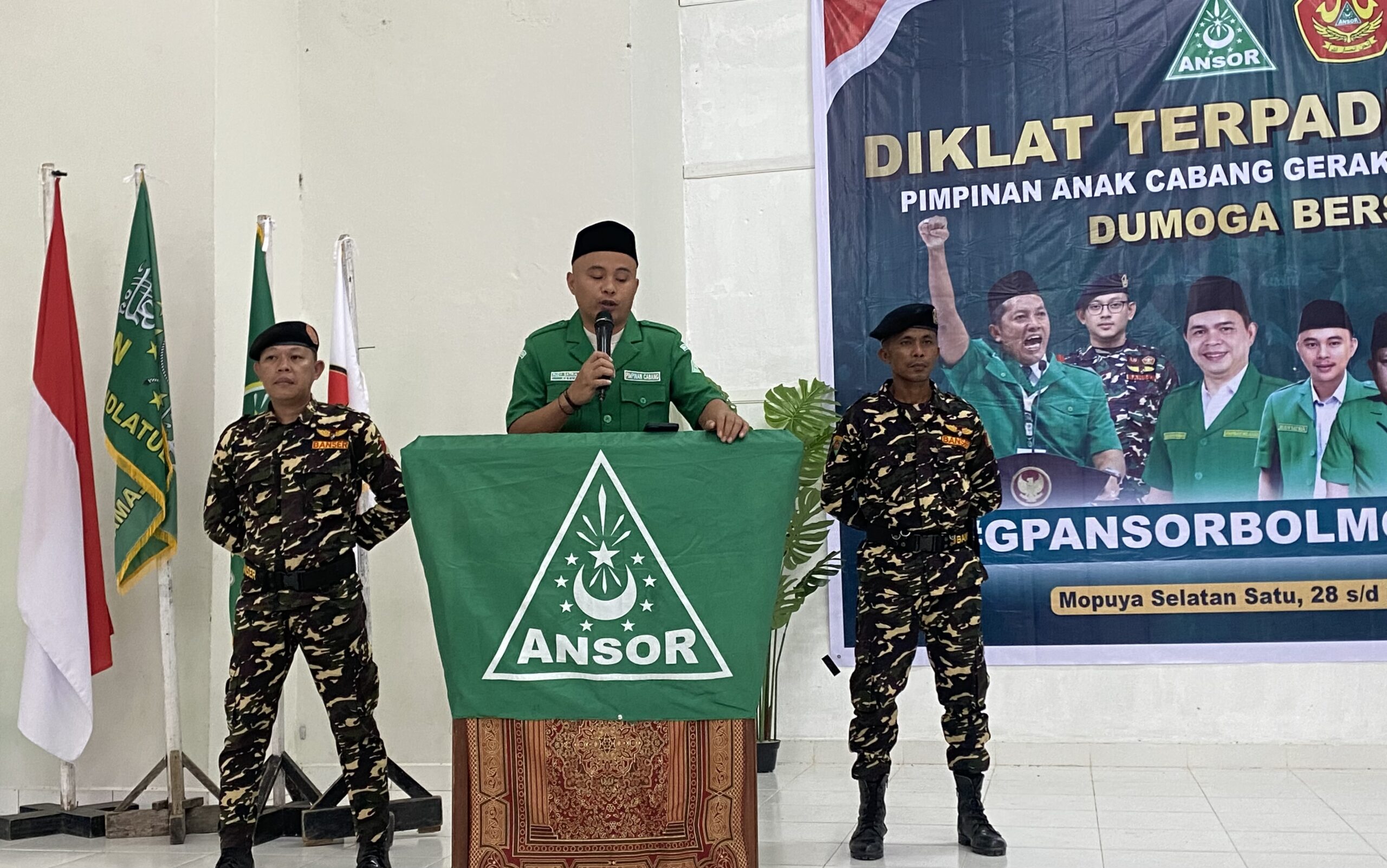 BOLMONG — Ketua GP Ansor Bolaang Mongondow, Rudi Satria Bonuot, resmi membuka Diklat Terpadu Dasar (DTD) pertama Gerakan Pemuda Ansor Dumoga Bersatu tahun 2025 yang berlangsung di Desa Mopuya Selatan, Jumat (28/2025). Kegiatan ini menjadi momentum penting bagi penguatan kapasitas kader Ansor dan Banser di wilayah Dumoga.