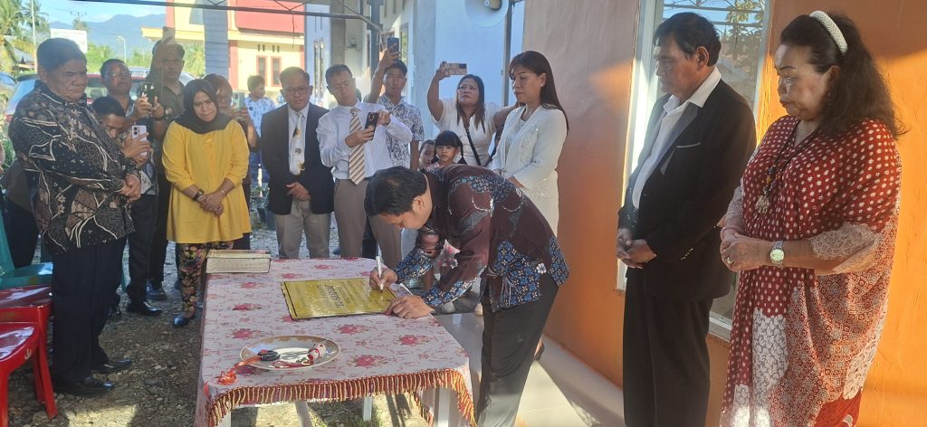Peresmian diawali dengan penandatanganan prasasti dan pengguntingan pita oleh Wabup Dony Lumenta, didampingi Sekretaris TP-PKK Bolmong, Ny. Syliane Lumenta, S.Th, serta Ketua Umum KGBI Indonesia, Pdt dr. Joubert Warouw, S.Th.