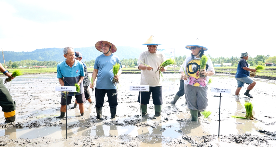 YSK tampak ikut menanam padi bersama Bupati Bolmong dan jajaran Forkopimda setempat. Kehadiran gubernur disambut antusias oleh kelompok tani dan masyarakat Desa Solog yang memadati area persawahan.